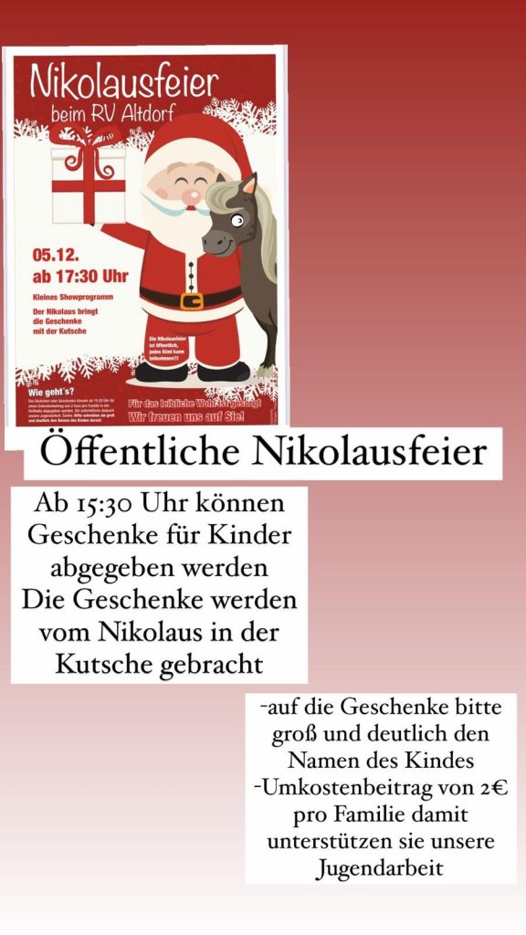 Am 5. Dezember 2025 findet unsere diesjährige Nikolausfeier statt. Neben einem kleinen Showprogramm bringt der Nikolaus die Geschenke mit der Kutsche.