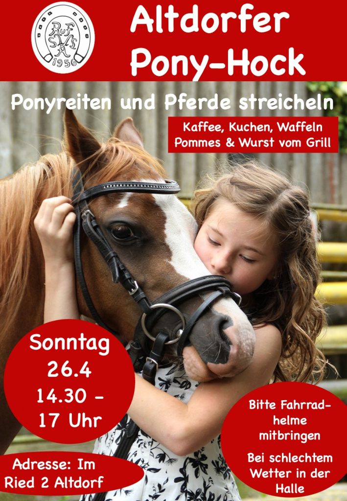 Der Reitverein Altdorf lädt herzlich zum Pony-Hoch am 26. April von 14:30 und 17 Uhr auf das Vereinsgelände ein. Für eine abwechslungsreiche Verpflegung wird gesorgt.